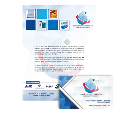 Con 10 años de experiencia en el gremio de las artes gráficas, contamos con la experiencia para desarrollar material promocional, comercial y de empaque, con altos estándares de calidad. Nuestros procesos se rigen con tecnología de avanzada, acorde con la demanda del mercado de hoy.